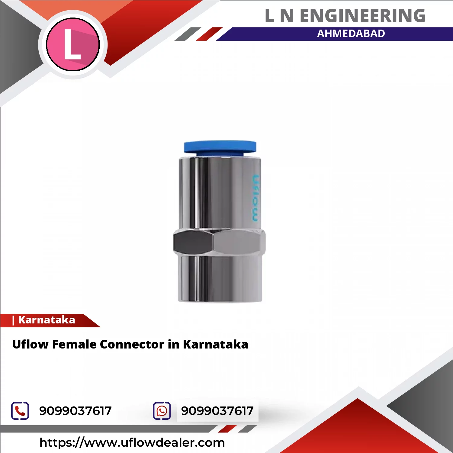 The Uflow Female Connector – VO Series is designed to ensure a strong, secure, and leak-proof connection within fluid and pneumatic systems, playing a vital role in maintaining overall system efficiency and reliability. Its primary function is to connect male-threaded components seamlessly, creating a tight and stable joint that prevents leakage and pressure loss during operation. The connector works by allowing the male fitting to be threaded into the precisely machined female port, where the internal threads grip firmly to create a secure seal. Depending on the application, sealing can be further enhanced using thread sealants or PTFE tape, ensuring that fluids such as air, water, oil, or other media flow smoothly without any interruption or loss. This tight connection helps maintain consistent pressure levels, which is especially important in systems where even minor leaks can affect performance or safety. The VO Series is built from high-quality materials that provide excellent resistance to corrosion, wear, and environmental factors, making it suitable for both indoor and outdoor use, as well as in demanding industrial conditions. Its design also allows for easy installation and removal, which simplifies system assembly, maintenance, and modifications, reducing downtime and effort for operators. Additionally, the connector helps absorb minor vibrations and misalignments within the system, contributing to overall stability and longevity of connected components. Because of its dependable performance and versatility, the VO Series is widely used in pneumatic lines, hydraulic systems, automation setups, and general industrial piping where secure and efficient connections are essential. For customers in Karnataka, L N Engineering serves as an authorised dealer for Uflow products, offering genuine connectors along with expert technical guidance, prompt delivery, and reliable after-sales support to ensure smooth and trouble-free operation.